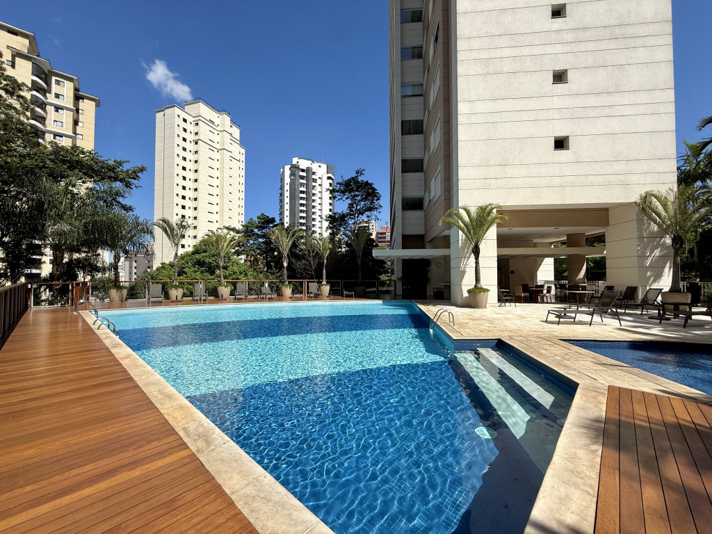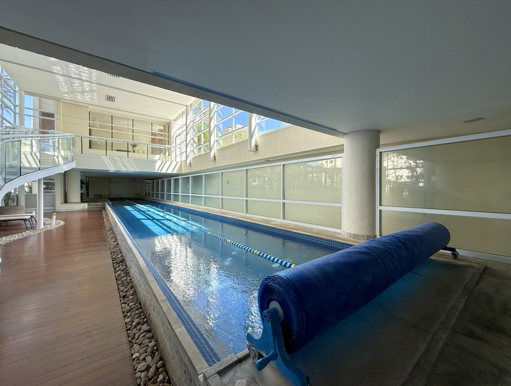 O condomínio oferece lazer completo: piscina de raia com 25 metros, piscinas externas ensolaradas, quadra de tênis, quadra poliesportiva e academia equipada.